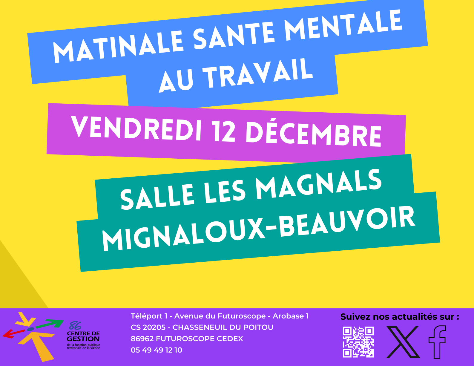 La matinale spéciale "santé mentale au travail" aura lieu le 12 décembre de 9h00 à 12h00 à la salle les Magnals à Mignaloux Beauvoir. Durant cette matinale, vous :